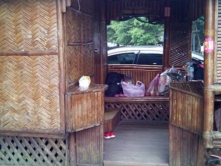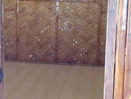 由門外拍進去木屋床況,很小,木屋牆壁還會看到竹編縫隙
