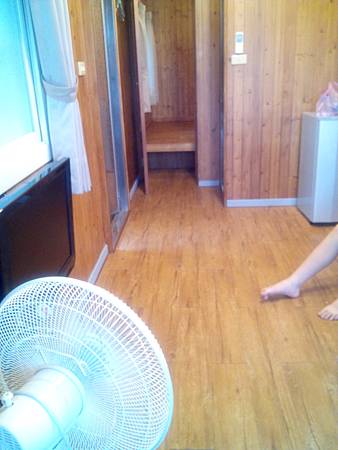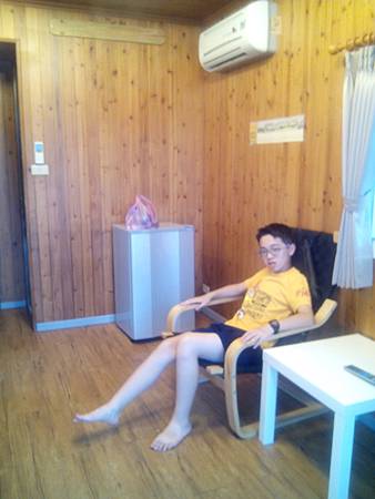 小木屋內有冷氣。冰箱。還有電風扇、桌椅喔。