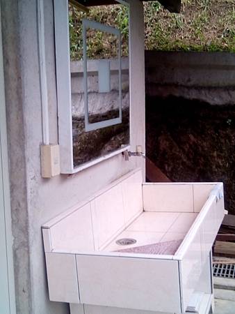 發現電源插頭設在洗手槽下方,真有創意,比較不怕風吹日晒雨淋哩!!