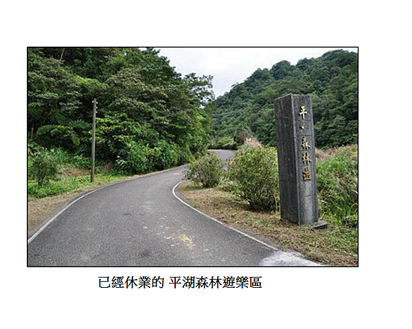 從產業道路往前開約1.4KM,會看見「平湖森林遊樂區」的標誌,但掉了幾個字,只剩「平 森林遊 」而已